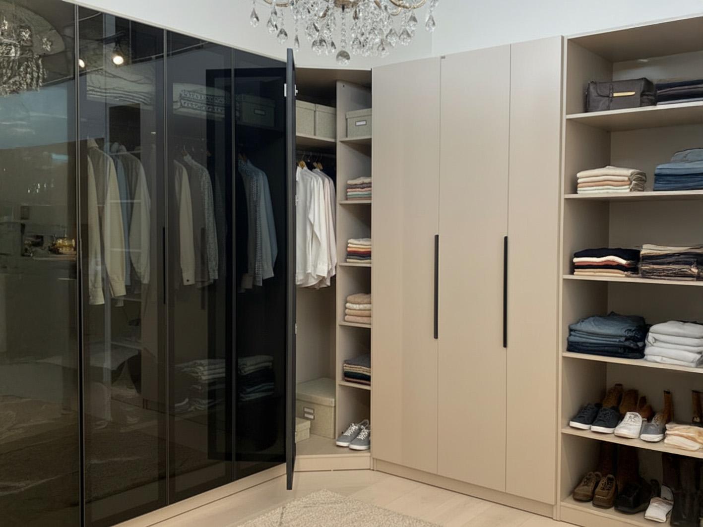 يأتي الدولاب بطول 95 سم × عرض 95 سم × عمق 60 سم × ارتفاع 240 سم. بذلك، يستفيد من الزاوية بشكل ذكي ويتيح مساحة واسعة لتخزين الملابس والمستلزمات اليومية.