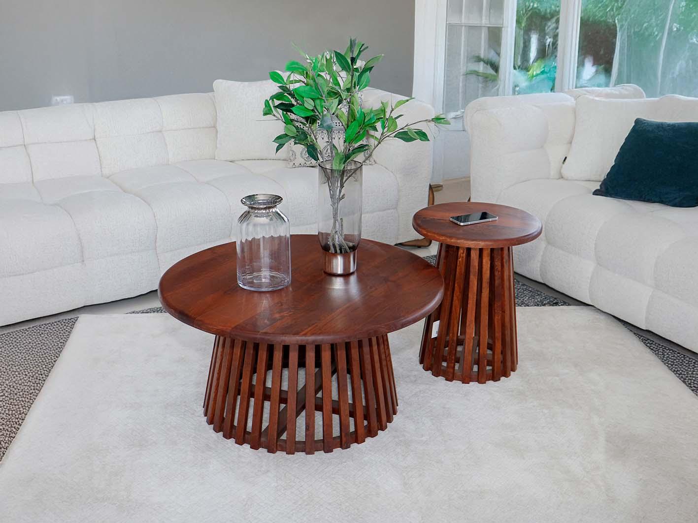 تصميم فريد: يتميز الطقم بجوانب خشبية منحوتة ولمسات دائرية ناعمة تمنحه مظهراً جذاباً يعكس ذوقك الرفيع. جودة استثنائية: مصنوع من خشب عالي الجودة يتمتع بالصلابة والمتانة، مما يضمن لك طاولة تبقى معك لسنوات طويلة دون أن تفقد جاذبيتها. استخدام مرن: يحتوي الطقم على طاولة قهوة رئيسية كبيرة وطاولتين جانبيتين بأحجام متناسقة، مما يجعله مناسباً للاستخدام اليومي أو عند استقبال الضيوف. سهولة التنسيق: يتماشى مع مختلف أنماط الديكور، سواء كان عصرياً أو كلاسيكياً، مما يمنحك مرونة في اختيار المكان المثالي له. صيانة سهلة: الطلاء الطبيعي المقاوم للرطوبة والأوساخ يجعل عملية التنظيف بسيطة، ليبقى الطقم في أبهى صورة دائماً.