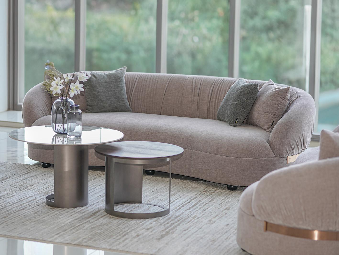 تتميز الكنبة بتصميمها المنحني الرائع الذي يضفي لمسة من الأناقة والجاذبية على أي مساحة. يمنح شكلها الانسيابي مظهراً راقياً يعزز جمالية ديكور غرفة المعيشة، مما يجعلها قطعة محورية تضفي طابعاً فخماً ومتناغماً في منزلك.