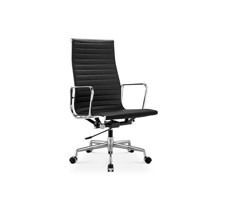 الكرسي مزود بظهر مرتفع مصنوع من هيكل قوي من سبيكة الألمنيوم المكروم، مع تشطيب فاخر من جلد الـ PU عالي الجودة. هذا المزيج يمنحك مظهراً عصرياً ودعماً إضافياً للظهر، مما يقلل من الإجهاد ويزيد من الراحة أثناء الجلوس لفترات طويلة.