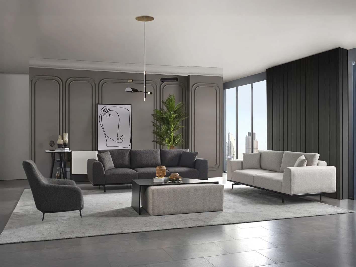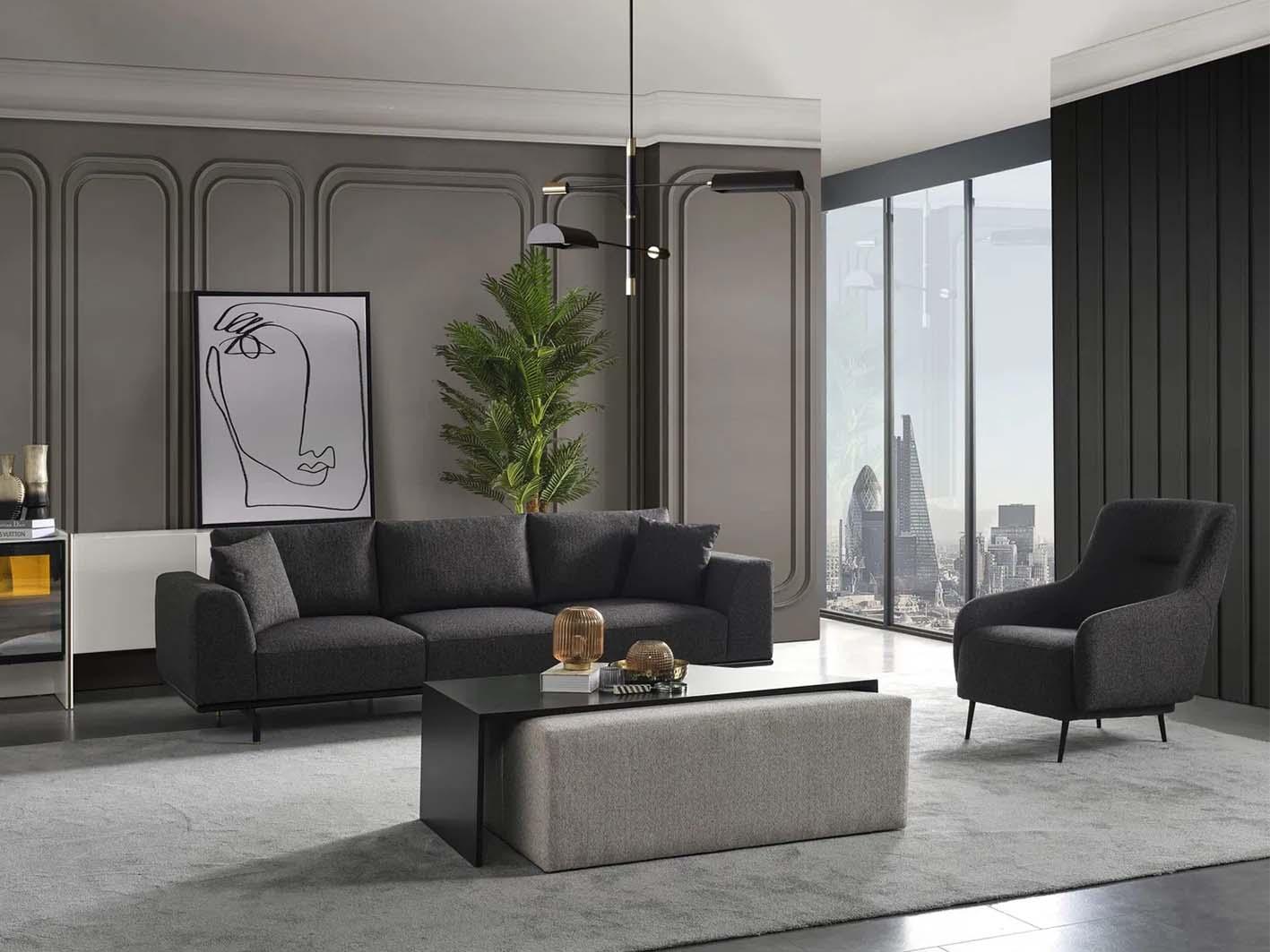 الكنب مغطى بقماش فاخر يتميز بلمسة ناعمة ومظهر أنيق، بينما يضفي اللون الرمادي القاتم مظهراً راقياً يناسب جميع الديكورات.