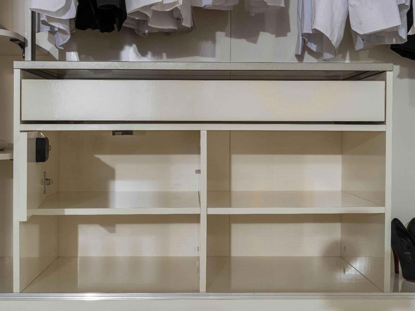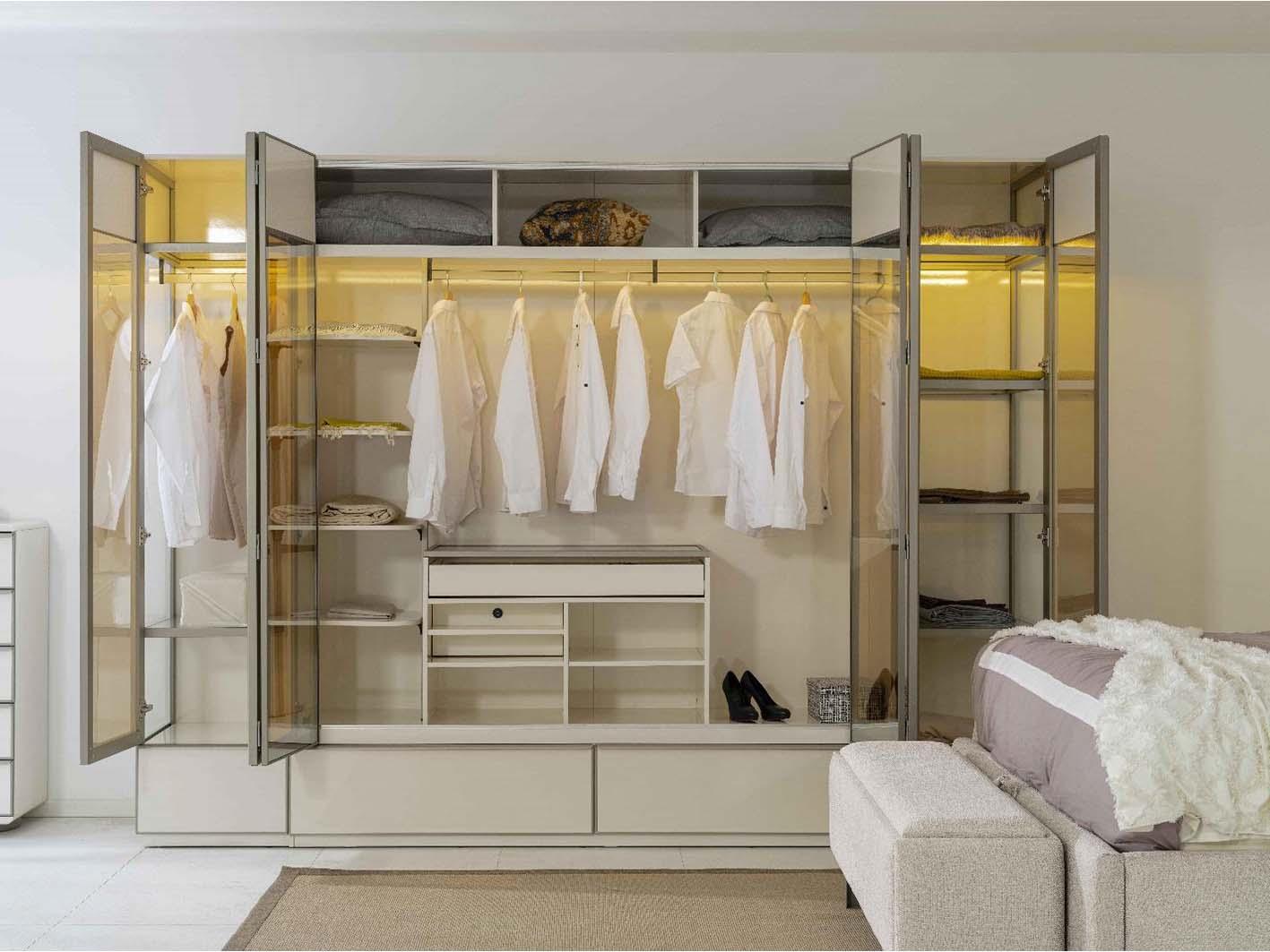 يتيح لك الدولاب استغلال المساحات بشكل مثالي، حيث يحتوي على أقسام داخلية متعددة لتخزين الملابس المعلقة، الرفوف المخصصة للملابس المطوية، وصناديق إضافية للإكسسوارات أو الأحذية. توفر الأبواب الستة توازنًا مثاليًا بين الإتاحة والحماية، بحيث تضمن بقاء الملابس بعيدة عن الغبار مع إبراز جمالها من خلال الزجاج الشفاف.
