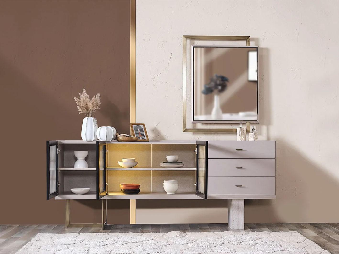 • في غرفة الطعام: يساعد في تخزين أدوات المائدة بطريقة مرتبة وعملية، مع عرضها بأسلوب جذاب بفضل الإضاءة الداخلية.