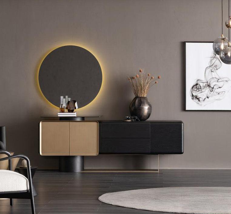 ارتقِ بأناقة منزلك مع كونسول فخم مع مرآة جراند الفاخر المدمج مع مرآة دائرية بإضاءة خلفية LED، تصميم يجمع بين الجمال العصري والعملية الفائقة في آنٍ واحد. الكونسول مصمم ليضفي لمسة من الفخامة والرقي على المساحات الداخلية سواء في مدخل المنزل أو في غرفة المعيشة، ويتميز بتناسق ألوان الأسود والنحاسي التي تعكس مزيجاً راقياً من الحداثة والكلاسيكية.