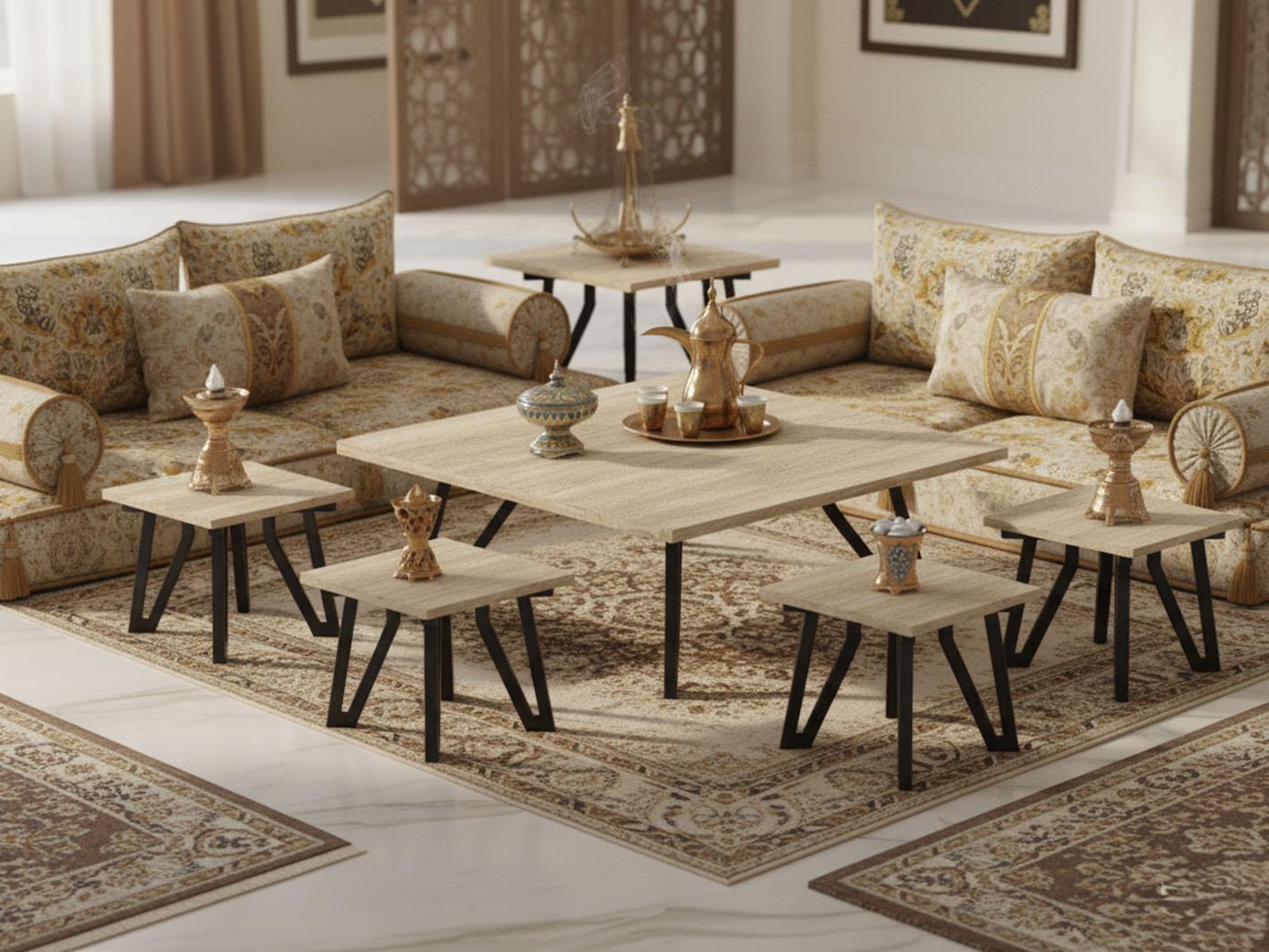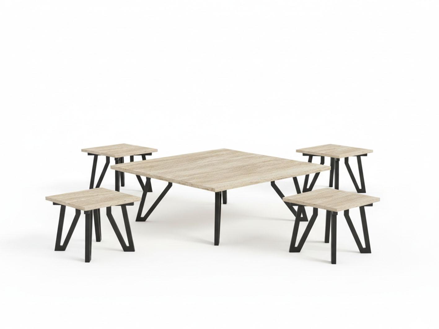 يأتي الطقم بتصميم مكون من خمس قطع تتكامل معًا لتوفر لك مرونة في الاستخدام وتنوعًا في الترتيب بما يناسب ذوقك ومساحة المكان. تتميز الطاولات بشكلها المربع الأنيق الذي يمنح تنسيق الجلسة مظهرًا متناغمًا، بينما تضفي الأرجل المعدنية بلونها الأسود طابعًا ميتاليك عصريًا يبرز جاذبية التصميم.