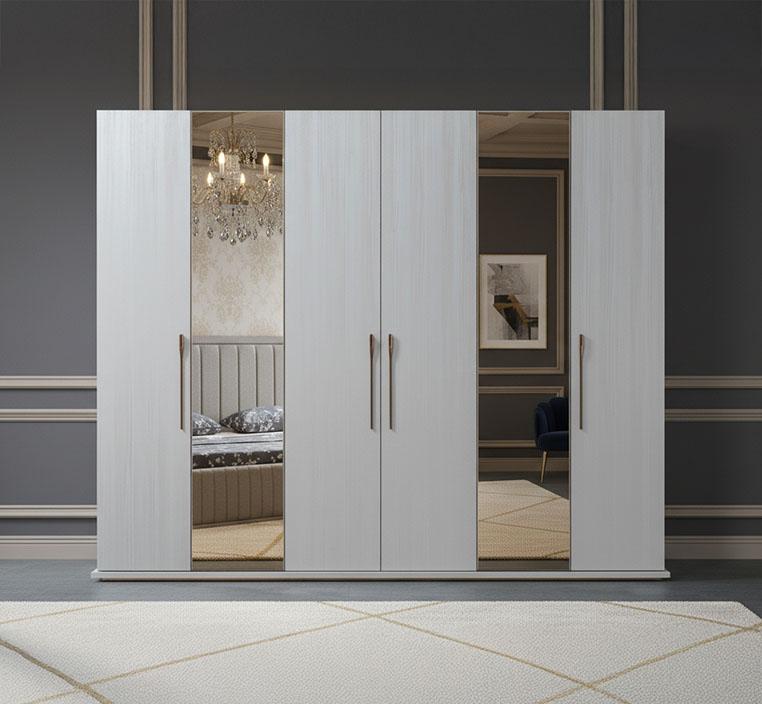 يأتيك الدولاب بستة أبواب مصممة لتتناسب مع كافة الاحتياجات، مع مرآتين أنيقتين في المنتصف تضيفان عمقًا بصريًا للمساحة وتعكسان الضوء بطريقة تزيد من إشراق الغرفة. كما أنها تمنحك الراحة أثناء اختيار ملابسك أو تنسيق إطلالتك اليومية.