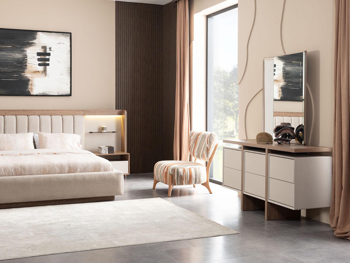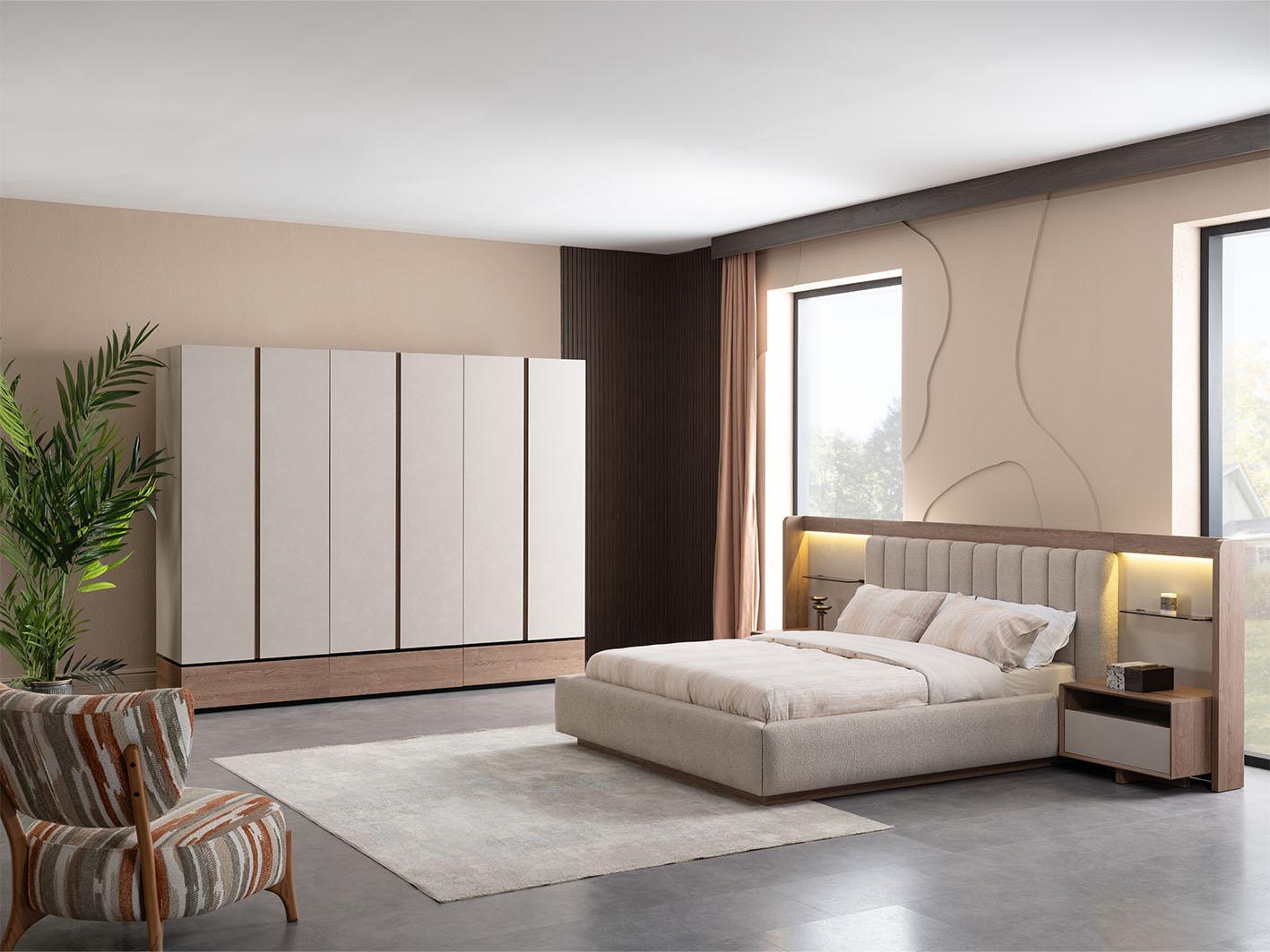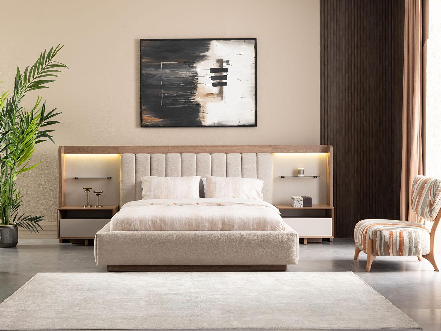 استمتع بأجواء من الفخامة والرقي مع طقم غرفة نوم لوجانو، المصمم خصيصًا ليجمع بين الأناقة والوظيفة في كل قطعة. يتميز السرير الرئيسي بحجم 180x200 بلمسات استثنائية حيث تم تنجيده بالقماش الفاخر الذي يضفي شعورًا رائعًا بالراحة والفخامة. يبرز اللوح الخلفي للسرير بوجود إضاءة مدمجة تضفي جوًا هادئًا ورومانسيًا، وتجعله نقطة تركيز أنيقة في الغرفة.