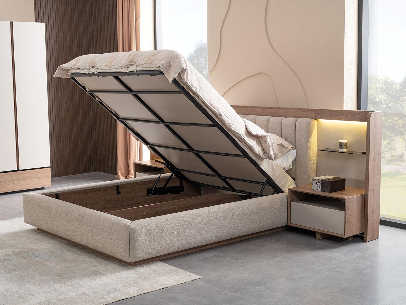أرفف عرض التحف والديكور: واحدة من أبرز مميزات غرفة نوم لوجانو هي الأرفف المدمجة في اللوح الخلفي للسرير، والتي توفر مساحة مثالية لعرض تحفك الفنية المفضلة أو الكتب والإكسسوارات، مما يمنح الغرفة لمسة شخصية ومظهرًا أنيقًا ومرتبًا.