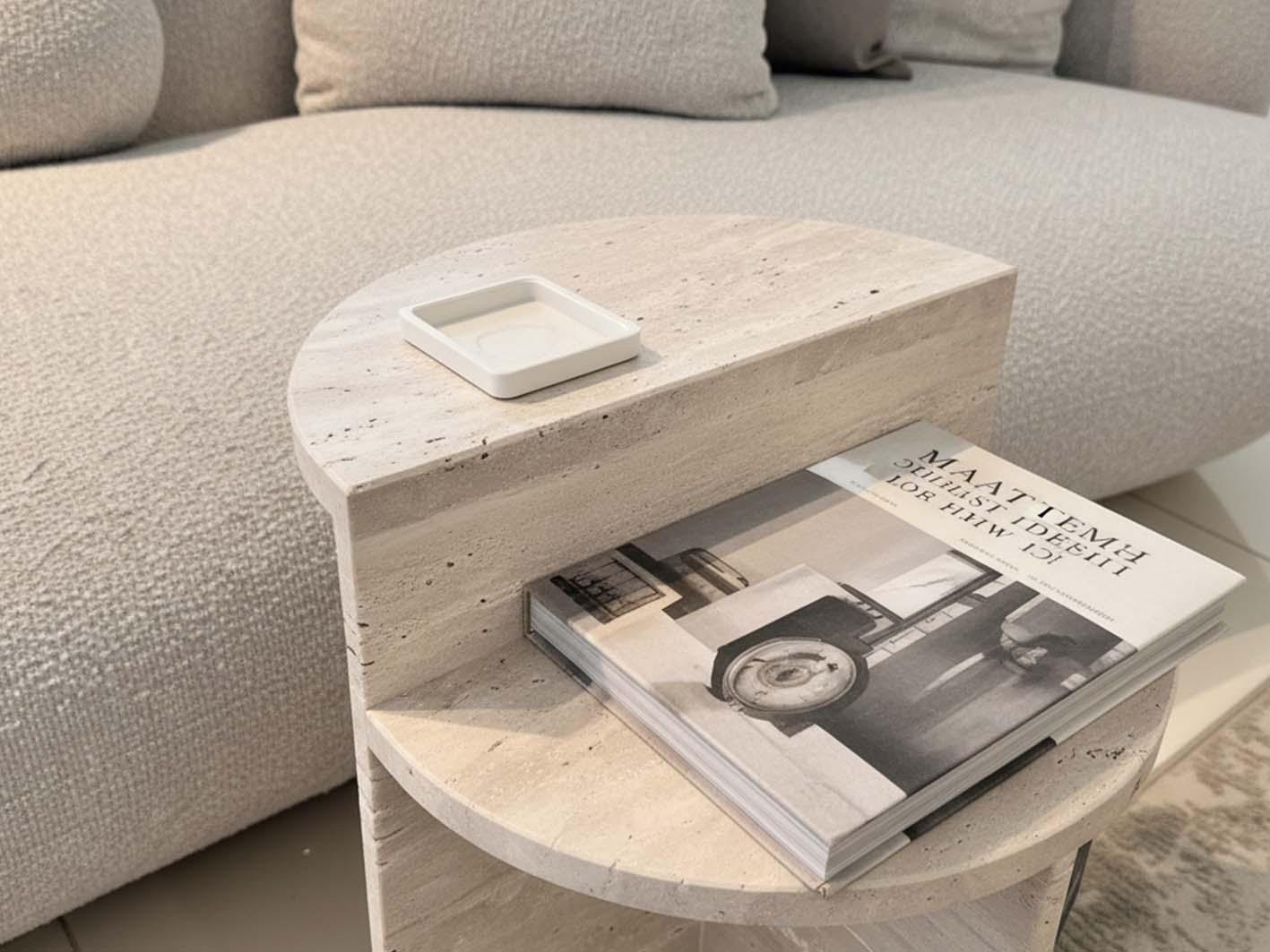 تأتي طاولة ريفولي بتصميم أنيق يجمع بين الجمال العملي واللمسة الطبيعية الراقية. سطحها العلوي المصنوع من الحجر التركي الفاخر يضفي إحساسًا بالفخامة والرقي، بينما تتكامل القاعدة بتصميمها المتين لتضفي على المكان توازنًا بصريًا جذابًا. أبعاد الطاولة المدروسة تجعلها مناسبة بجانب الأريكة أو السرير، لتكمل جمال المساحة بأسلوب راقٍ.