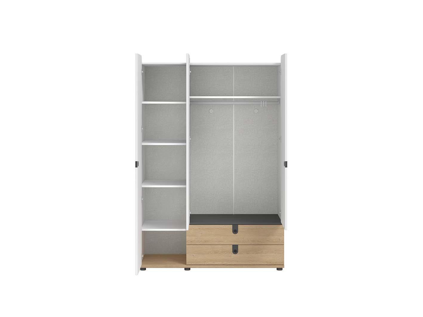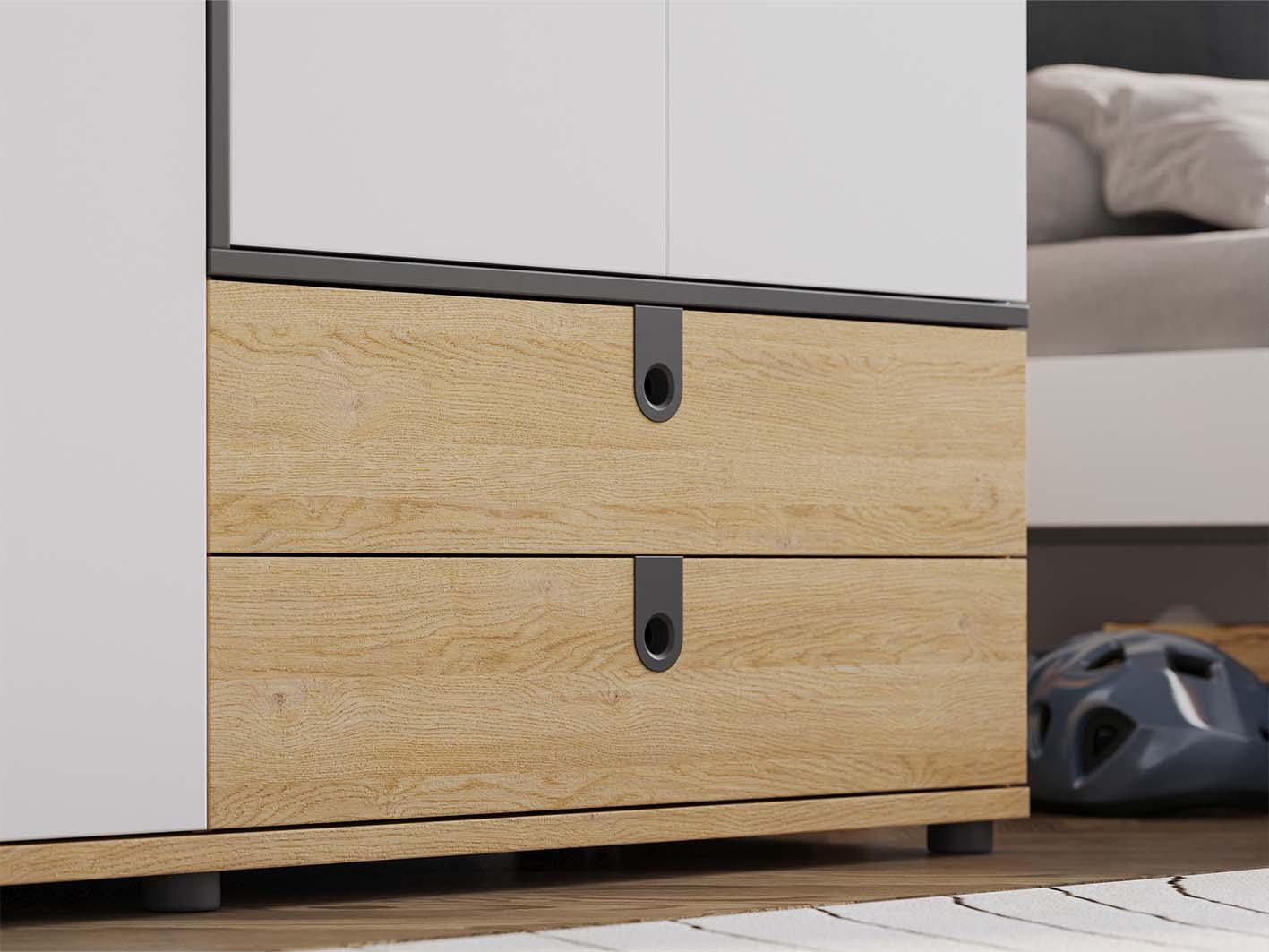 أبواب الدولاب مصنوعة من خشب مطلي باللون الأبيض عالي الجودة، في حين أن الأدراج ولوح القاعدة مصنوعان من خشب طبيعي قوي يضمن المتانة والاستدامة.
