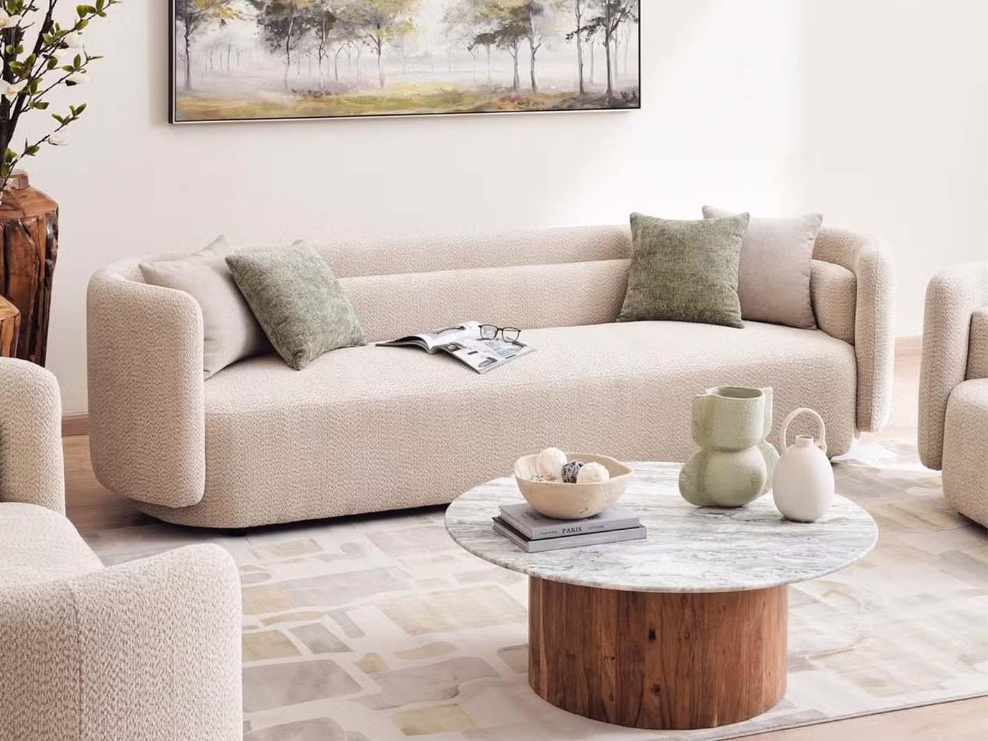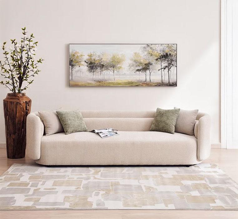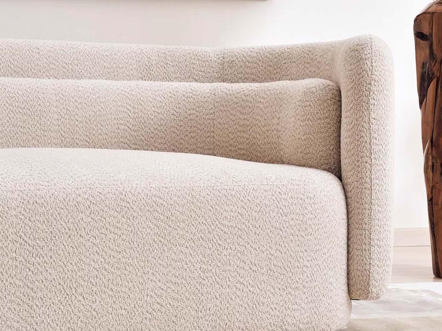 • تنجيد فاخر بقماش البوكلية الناعم: يضفي قماش البوكلية الفاخر ملمسًا ناعمًا ومظهرًا أنيقًا يتناسب مع مختلف أنماط الديكور.
