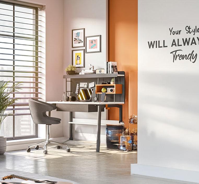 • يتميز المكتب بخطوط نظيفة وألوان عصرية متناسقة من الأبيض والأسود مع لمسات برتقالية. يوفر مساحة مثالية للدراسة، العمل، أو حتى لمهامك الإبداعية.