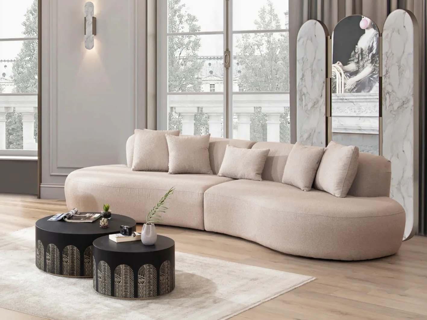 تمتاز الكنبة بتصميم دائري مبتكر يواكب أحدث اتجاهات الأثاث العصري، حيث تتناغم الخطوط المنحنية برقة لتضفي شعورًا بالدفء والانسيابية داخل مساحتك المنزلية. إن اللون البيج الهادئ يجعلها قطعة متناغمة مع مختلف ألوان وأنماط الديكور، مما يمنح الغرفة مظهرًا متزنًا ومريحًا.