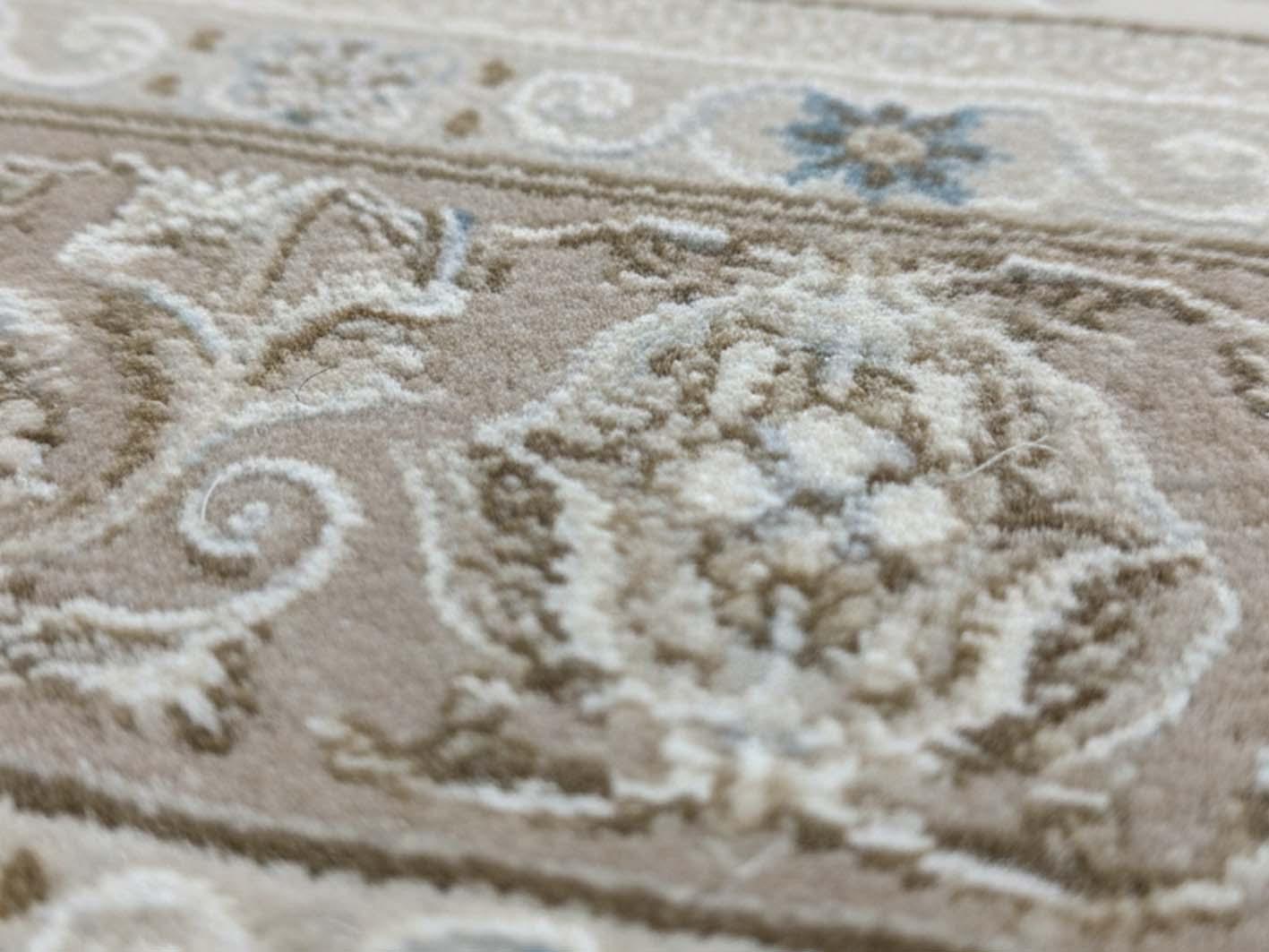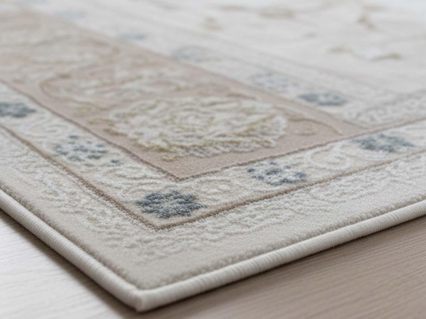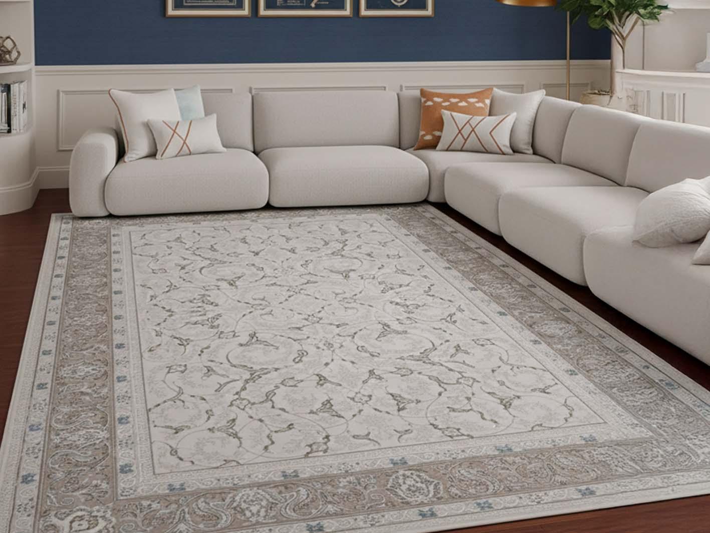 يتميز السجاد بنقوش شرقية هادئة وألوان متناسقة تمنح الغرفة طابعًا أنيقًا. وتساعد درجات الأبيض والبيج والرمادي على خلق جو مريح يناسب مختلف أنماط الديكور.