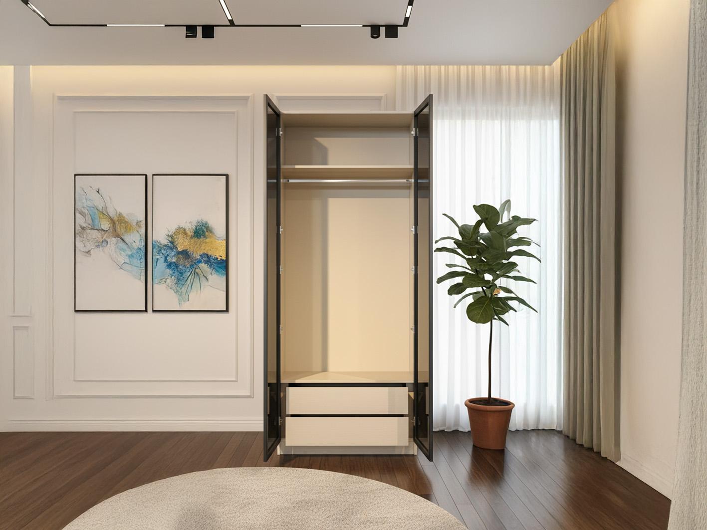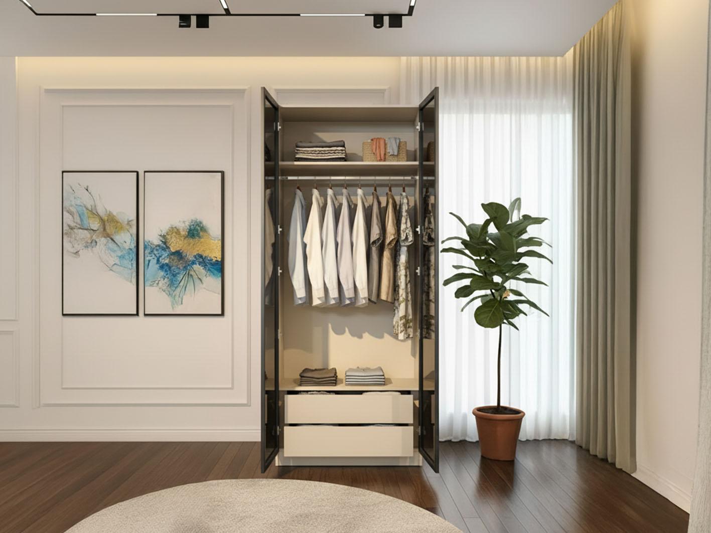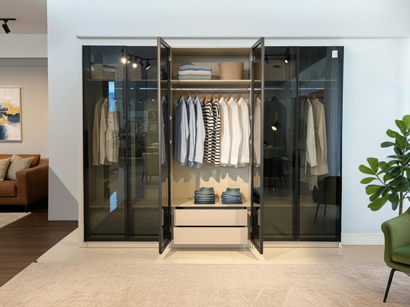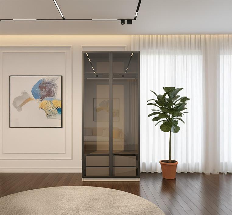 البابان الزجاجيان يضفيان لمسة عصرية على الغرفة. كما تسمح الرؤية الجزئية للمحتويات بالعثور على الملابس بسرعة وسهولة.