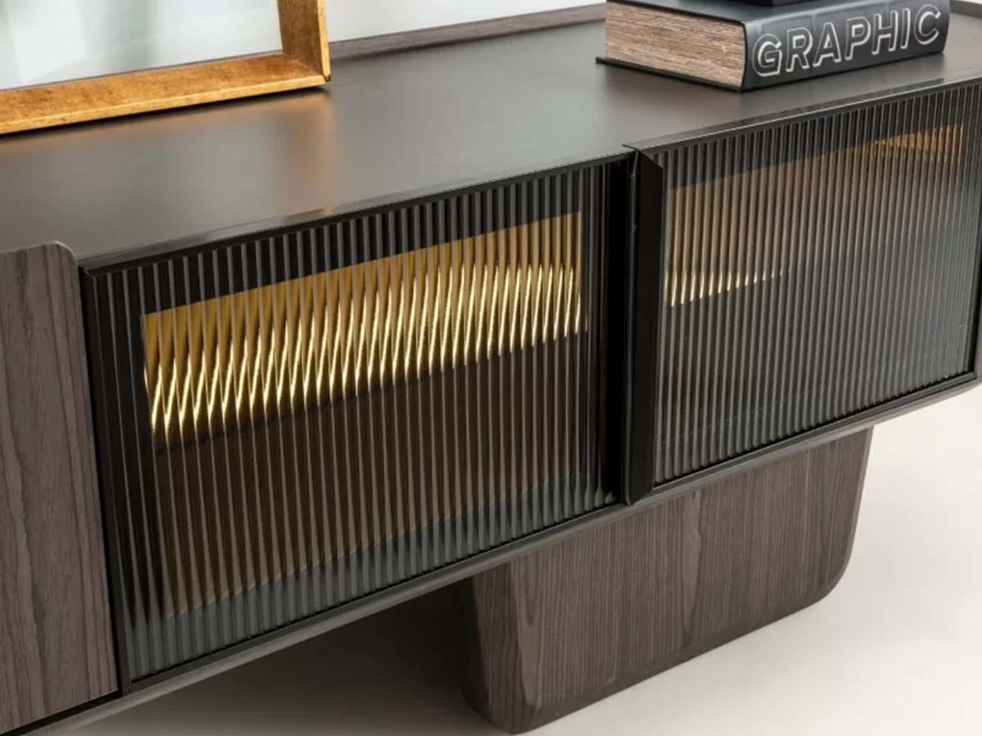 الزجاج المزخرف بتصميم زيغ-زاك يمنح الطاولة لمسة فنية مميزة ويضيف طابعًا عصريًا، مع الحفاظ على شفافية لطيفة لعرض محتويات الخزائن بطريقة ملفتة للنظر.