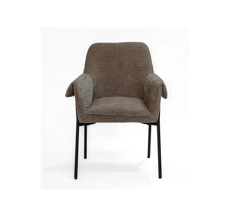 تعتمد قاعدة الكرسي على أرجل معدنية قوية بلون أسود غير لامع، تمنح الكرسي ثباتًا وأناقة صناعية متقنة، وتضيف لمسة تباين جذابة مع لون القماش البني.