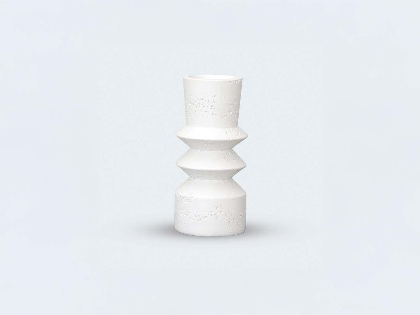 حامل شموع سيراميكي أنيق ومتميز. تصميمه الحائر بين الأشكال الهندسية والأشكال العضوية يضفي لمسة من الأناقة والتفرد. السطح الأبيض المحفور بنمط متناسق يمنح هذه القطعة رونقًا وشخصية خاصة. سيكون هذا الحامل إضافة جمالية رائعة لأي طاولة أو رف، سواء لإضافة شموع أو اعتباره قطعة ديكورية بحد ذاتها. إنه يوازن بشكل مثير للإعجاب بين البساطة والتعقيد، ما يجعله قطعة فنية رائعة تثري المساحة المحيطة بها.