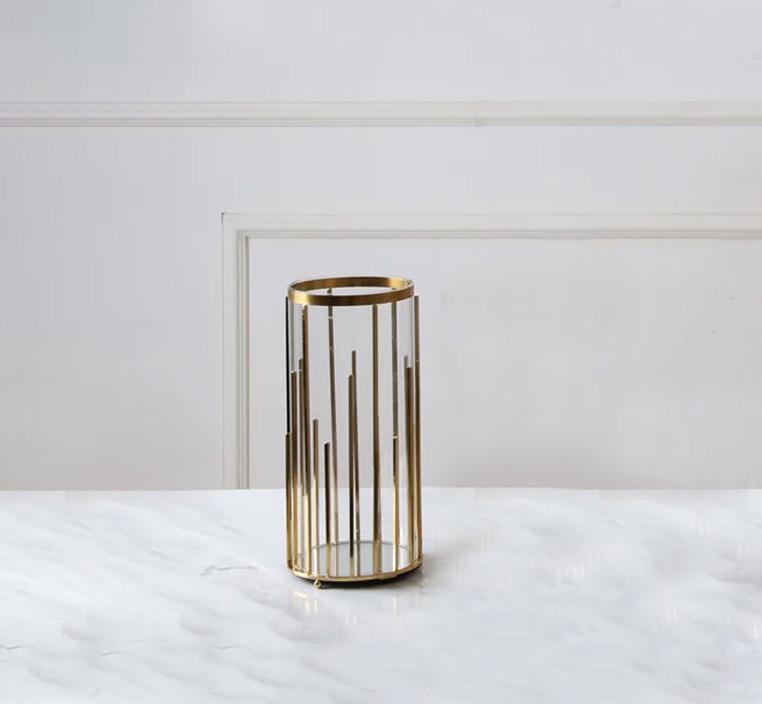 استمتع بأجواء الدفء والاناقة مع حامل الشموع هذا. تصميمه الفريد والأنيق يضفي لمسة من الجمال والأناقة على أي مكان. يتميز بتصميم متفرد يجمع بين الأناقة الكلاسيكية والتصميم العصري. يتميز بشكله الهندسي الأنيق، حيث يتميز بخطوط ذهبية ناعمة وأنيقة مع انبوب زجاجي يضفي اليه جمالا وروعة,يمكن استخدام حامل الشموع في العديد من الأماكن، سواء في غرفة المعيشة أو غرفة النوم أو حتى في الحمام.فيمكن دمجه بسهولة مع أي ديكور داخلي.