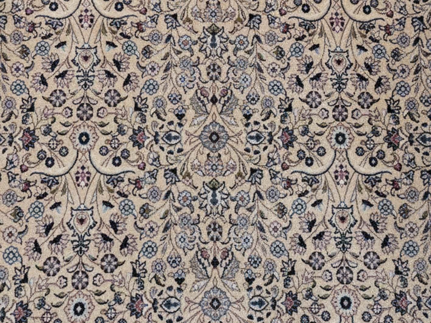 ويتميز تصميم السجادة بنمط شرقي دقيقة تمنحها طابعًا غنيًا بالتفاصيل، بدءًا من الإطار الخارجي متعدد الطبقات وحتى النقوش المتناسقة في الوسط. لذلك، تظهر السجادة كقطعة فنية تضيف عمقًا وأناقة لأي غرفة، سواء كانت غرفة معيشة، مجلسًا عصريًا، أو غرفة نوم تحتاج إلى لمسة من الدفء والرقي. كما يسهم توازن النقوش في إبراز مساحات الغرفة بشكل أكثر جمالًا دون ازدحام بصري.