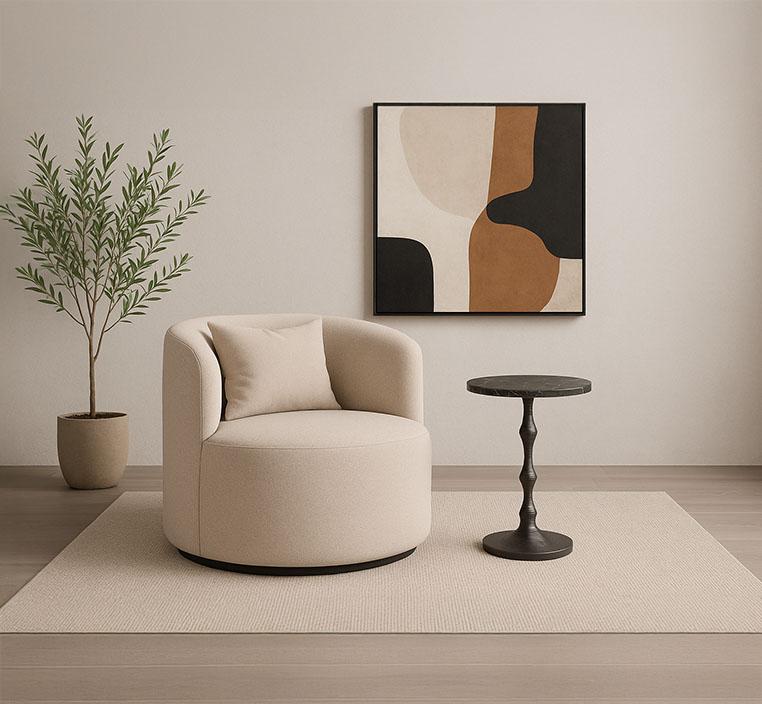 اللون البيج المحايد يتيح لك دمج الكرسي بسهولة مع مختلف عناصر ديكورك. يمكنك استخدامه لإنشاء ركن مميز أو كجزء من مجموعة جلوس متكاملة. تصميمه العصري يجعله مناسبًا لكل الأذواق.