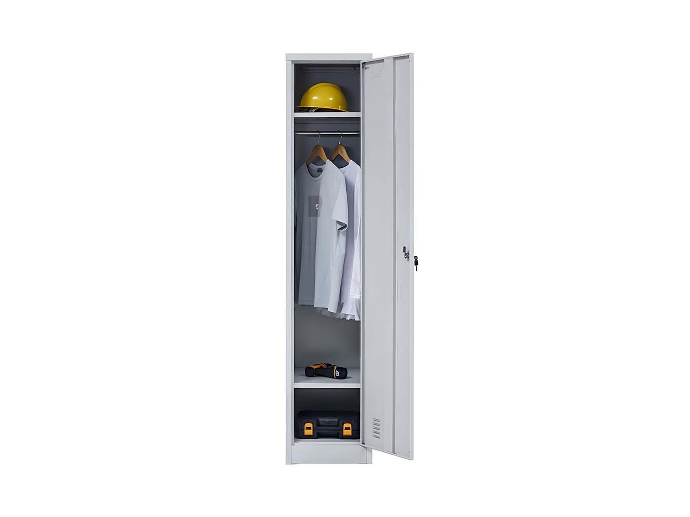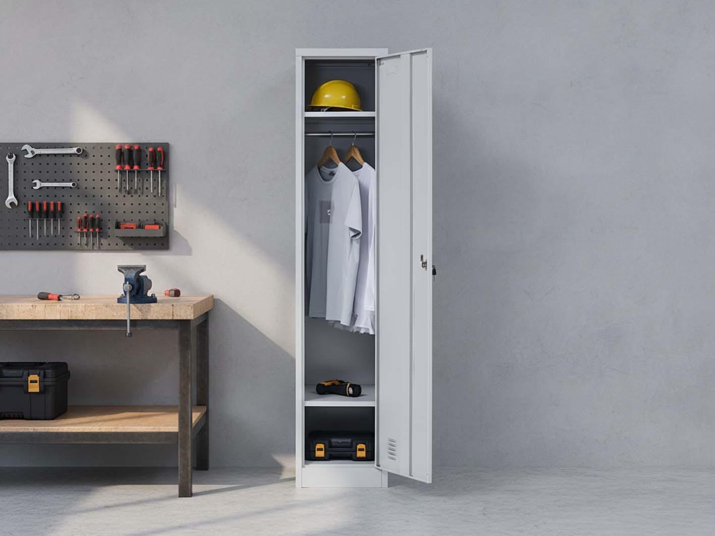 يحتوي التصميم على عمود تعليق داخلي لتعليق المعاطف، السترات، أو الزي الرسمي، مما يمنع تجعد الملابس ويحافظ على مظهرها مرتبًا وأنيقًا. هذه الميزة أساسية للعمال الذين يحتاجون إلى ملابس نظيفة ومرتبة يوميًا.