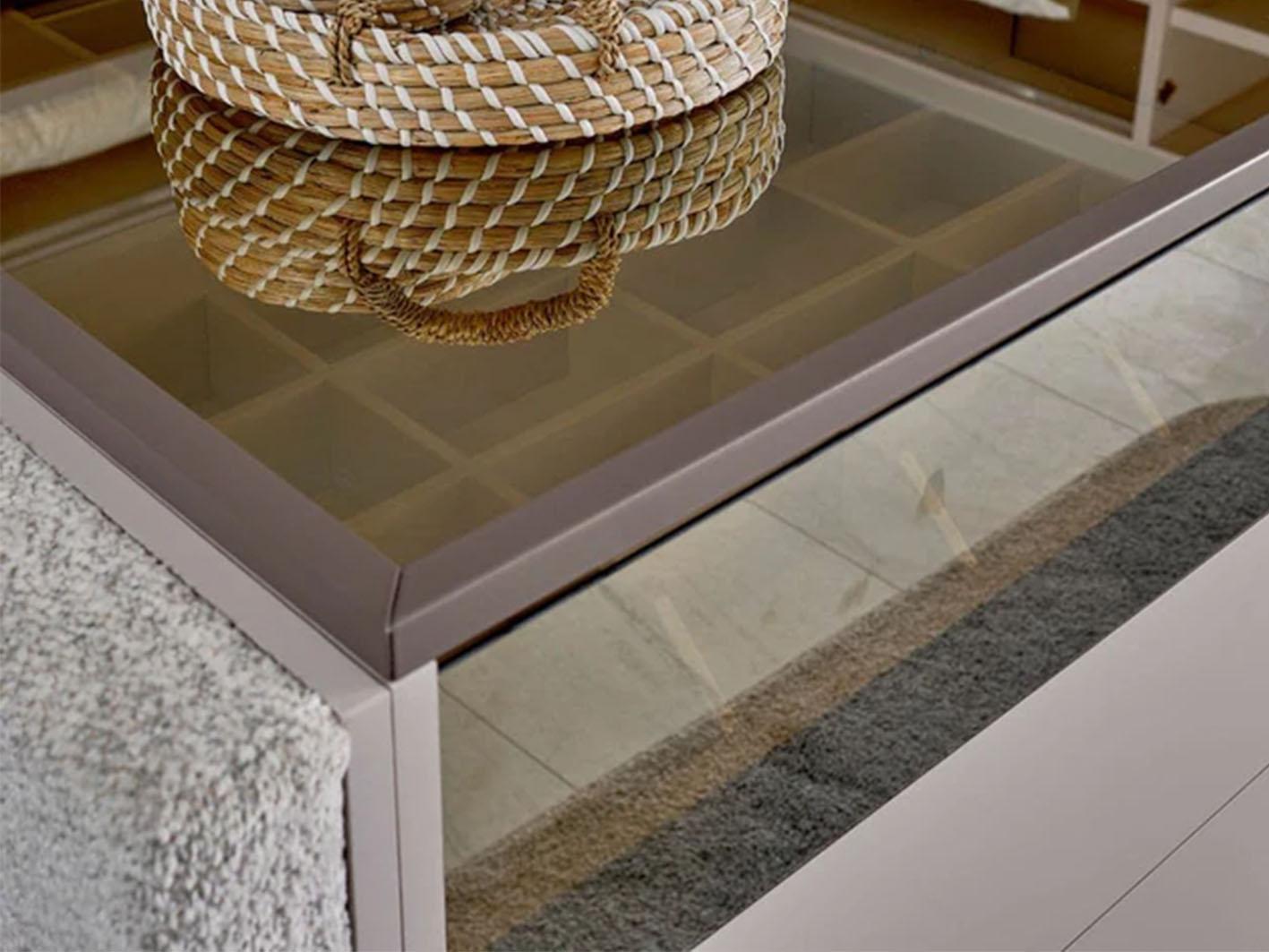 الجزء الخاص بالتخزين يحتوي على أربعة أدراج، مع درج علوي بسطح زجاجي لحفظ المقتنيات الثمينة. هذه الأدراج توفر لك ترتيبًا مرتبًا للأغراض الصغيرة والكبيرة على حد سواء.