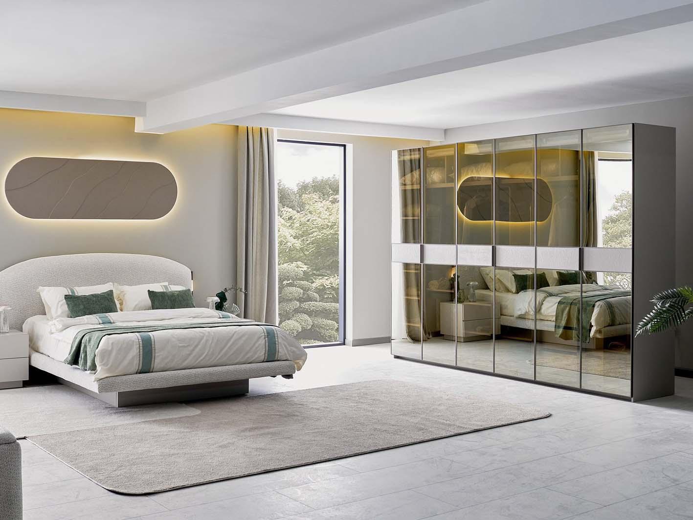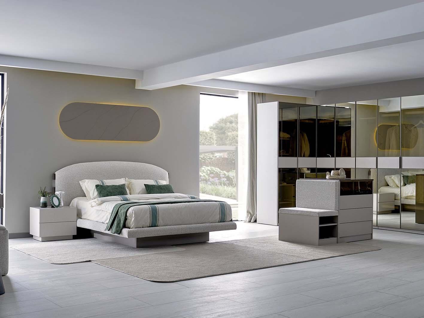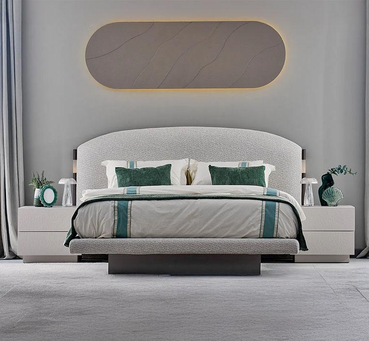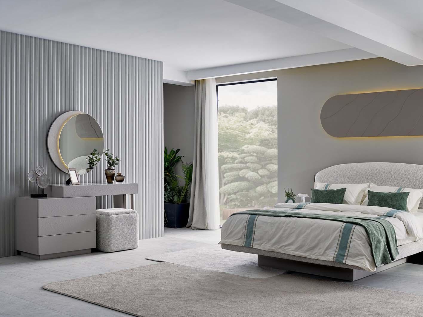 يعتمد التصميم على تدرجات اللون الكريمي الهادئة، مما يضفي شعورًا بالسكينة. كما أن خطوطه الانسيابية تمنح الغرفة مظهرًا عصريًا وفخمًا في الوقت نفسه.