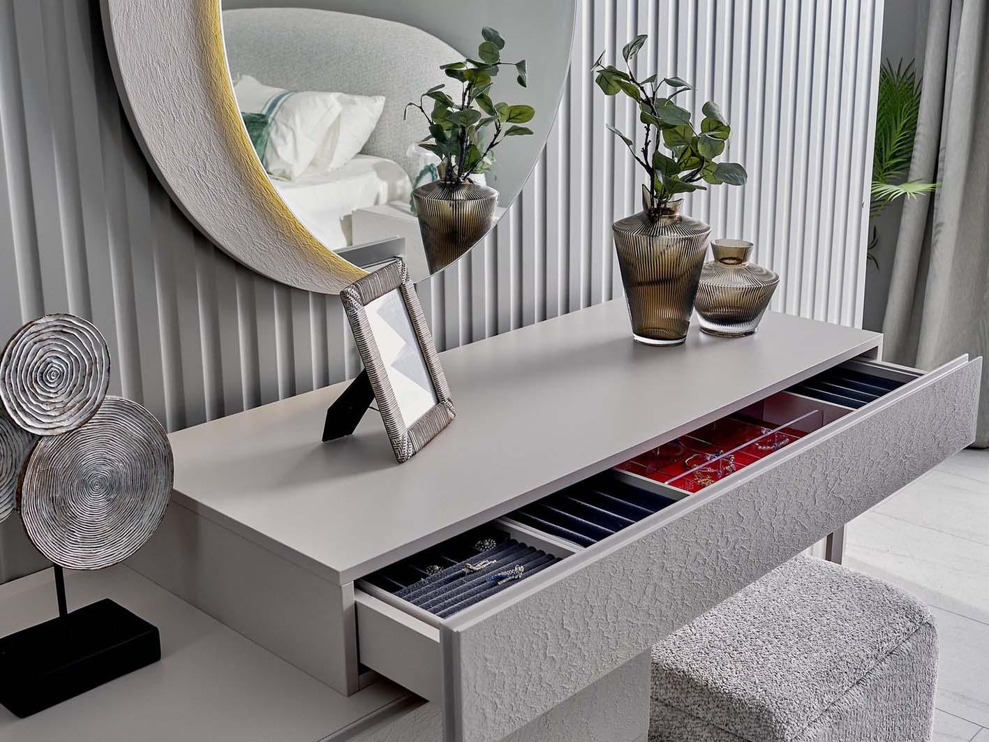 تأتي التسريحة مع مرآة مستديرة تضيف بعدًا جماليًا للمكان. كما أن تصميمها العملي يوفر لك مساحة مثالية للعناية اليومية.