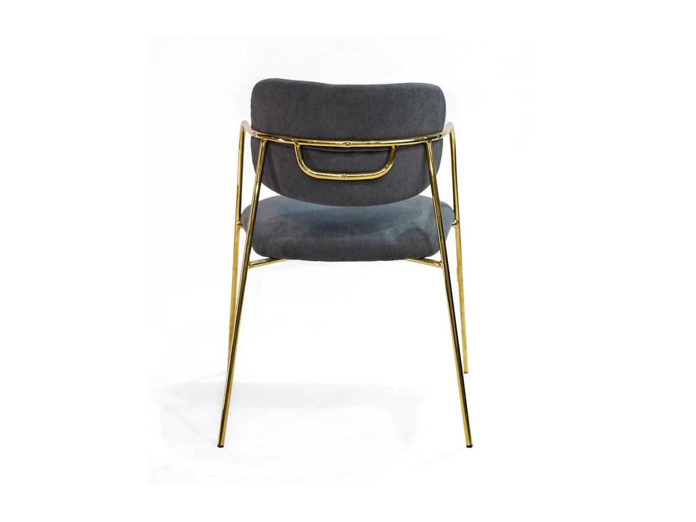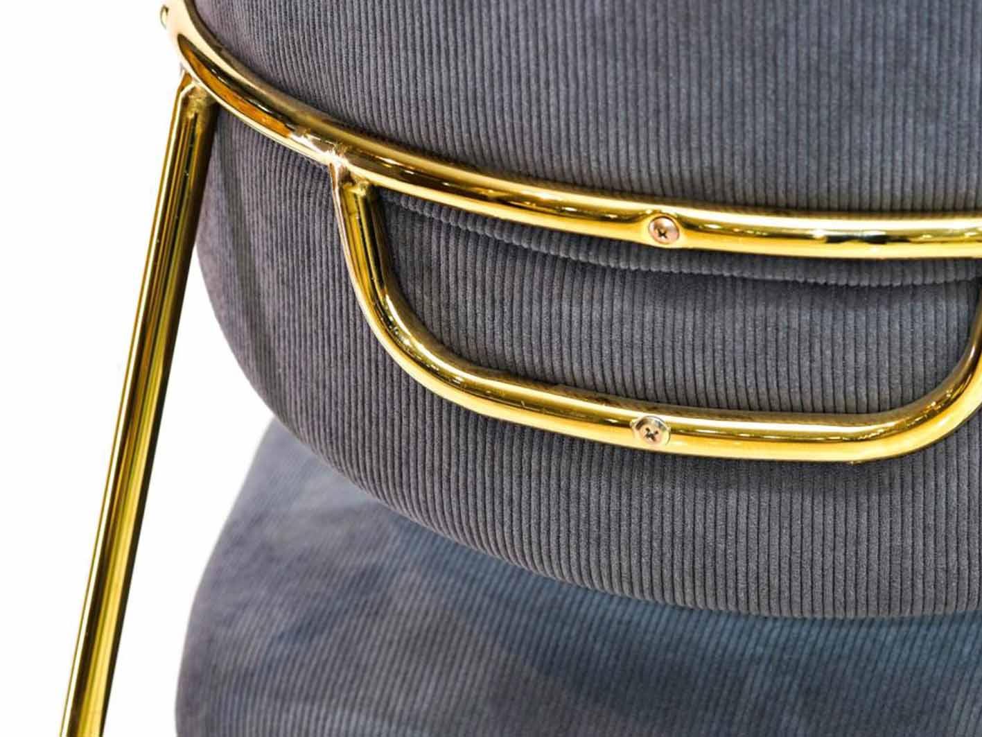 أرجل الكرسي مصنوعة من المعدن المطلي باللون الذهبي اللامع، ما يضيف لمسة من الفخامة والدفء إلى التصميم العام. كما يزين ظهر الكرسي شريط معدني ذهبي أنيق، يُبرز جماله من جميع الزوايا ويجعله قطعة ديكور قائمة بذاتها، سواء في غرفة الطعام، المكتب، أو صالة الجلوس.