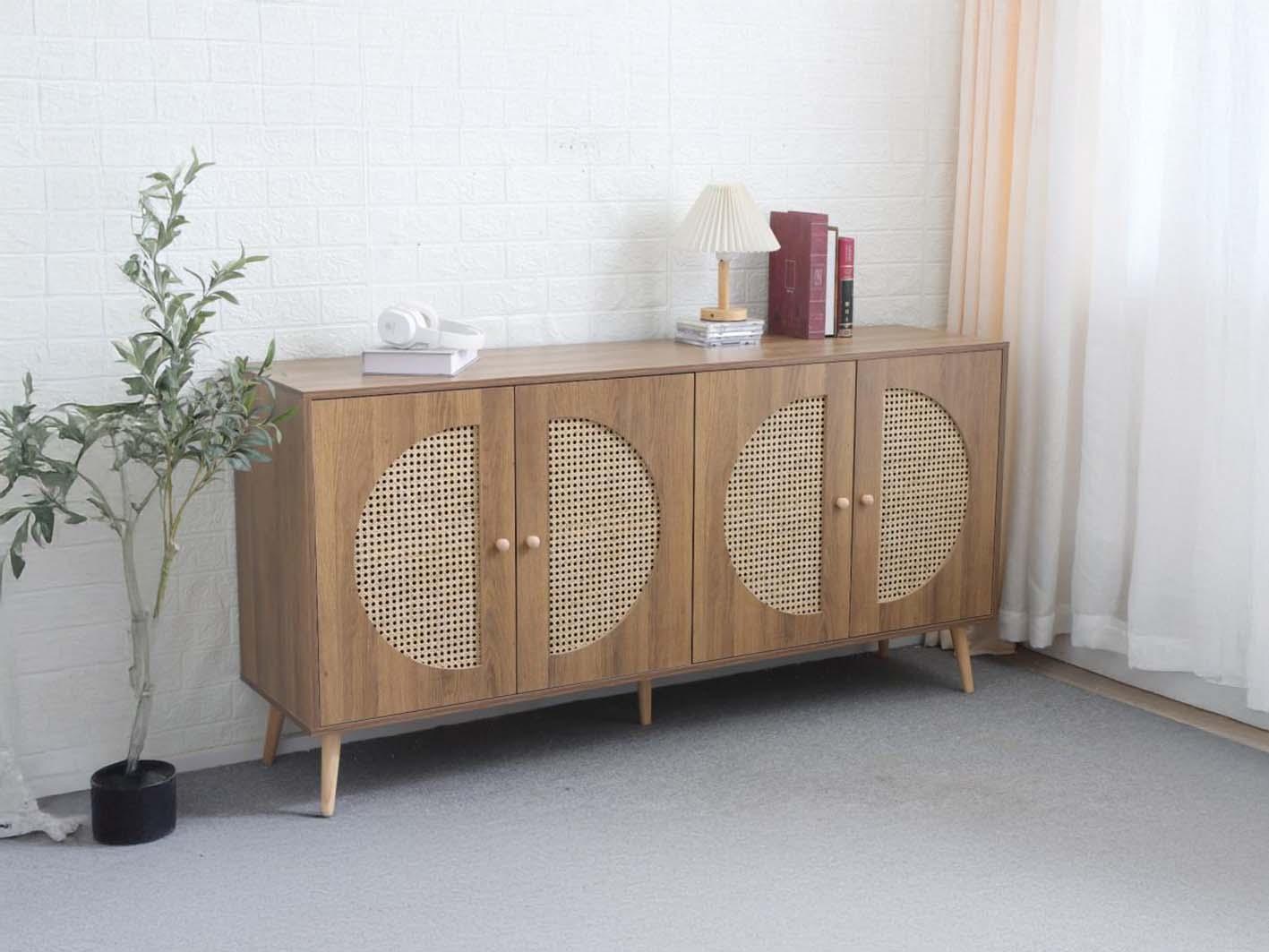صُنع بوفيه نيارا من خشب MDF عالي الجودة، المعروف بمتانته ومقاومته للرطوبة والخدوش، ما يجعله عمليًا في الاستخدام اليومي. اللون البني الفاتح يضفي مظهرًا طبيعيًا ودافئًا يتماشى مع مختلف أنماط الديكور، بينما تعزز النقوش الهندية على الأبواب من الطابع الفني لهذه القطعة.