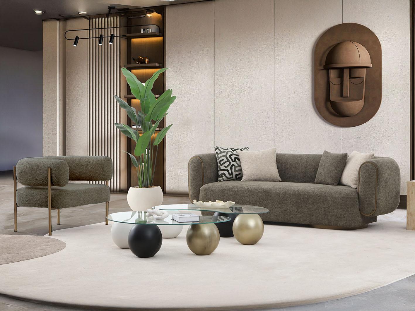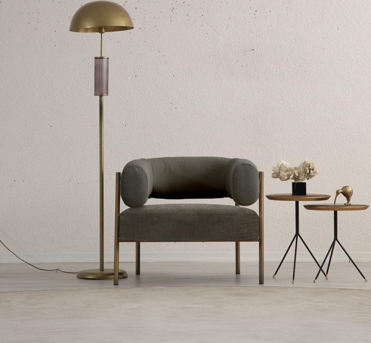 الهيكل الداخلي مصنوع من خشب الـ PLYWOOD عالي الجودة لضمان المتانة وطول العمر، بينما تأتي الأرجل المعدنية بتشطيب ذهبي مصقول (Brushed Gold)، لتمنح الكنبة طابعًا فخمًا يعكس الذوق الرفيع.