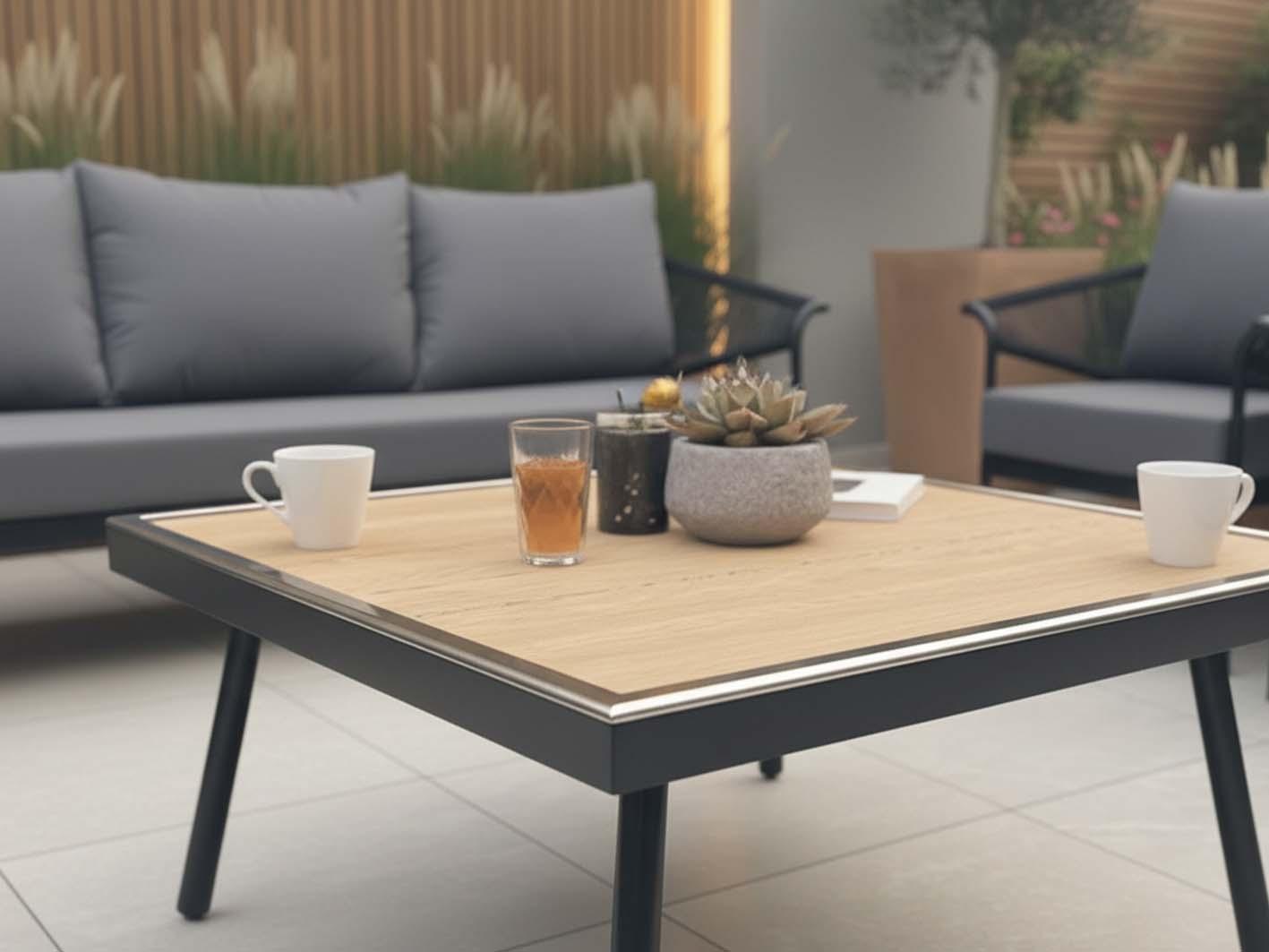 تأتي الطاولة بتصميم أنيق بسطح بلون خشبي فاتح يمنح الجلسة مظهرًا دافئًا وطبيعيًا، ويضيف لمسة من التباين الجميل مع الهيكل الرمادي. السطح الخشبي سهل التنظيف ومقاوم للخدوش، مما يجعله مثاليًا لوضع المشروبات والوجبات الخفيفة والإكسسوارات الخارجية.