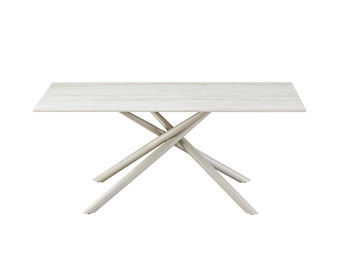 تستند الطاولة إلى قاعدة مصنوعة من الاستيل الصلب عالي الجودة، بتصميم هندسي عصري يوفر دعمًا مثاليًا وثباتًا قويًا. هذا الإطار المعدني لا يمنح الطاولة متانة فقط، بل يضيف أيضًا لمسة من الحداثة والرقي إلى التصميم العام.