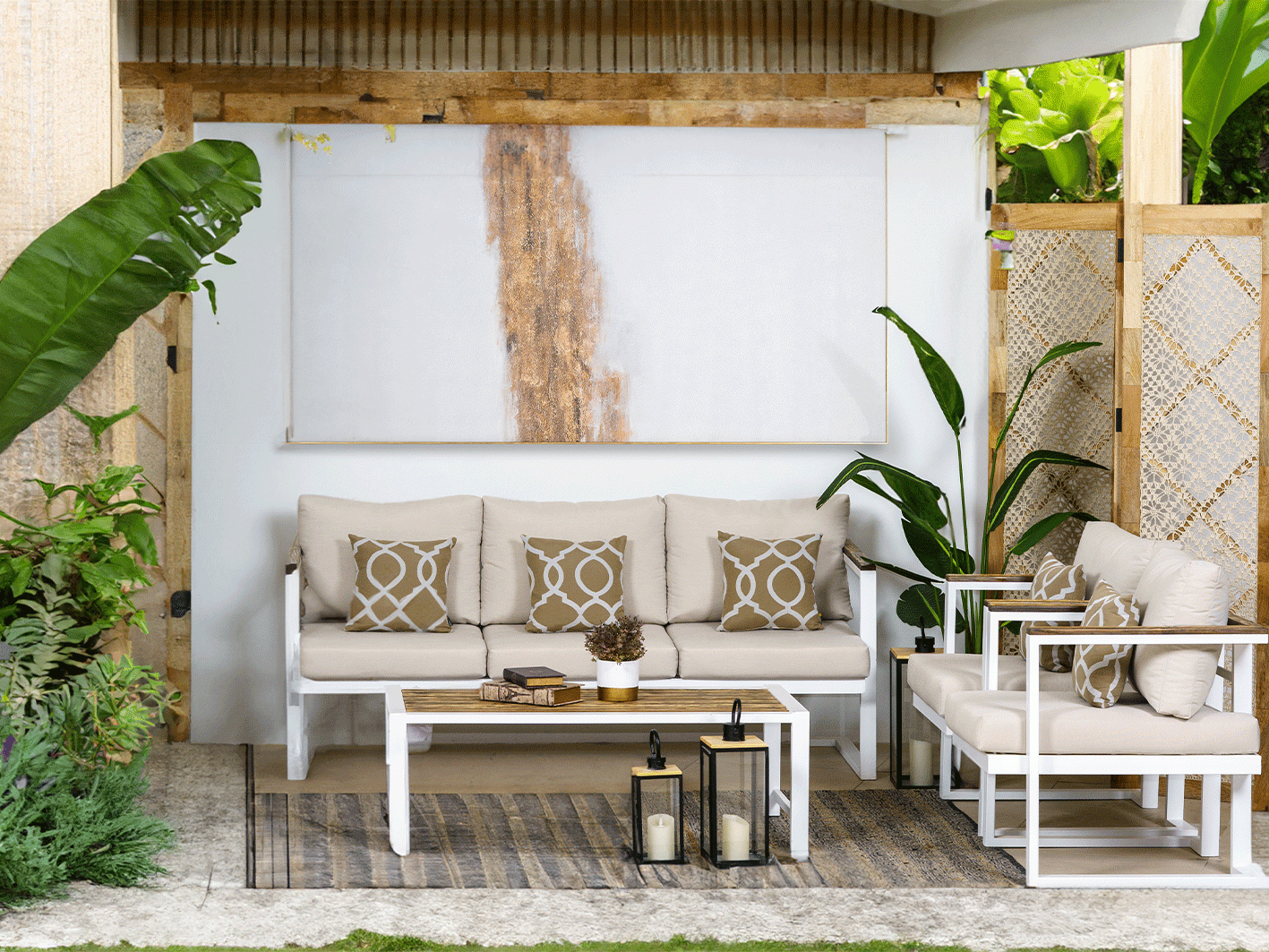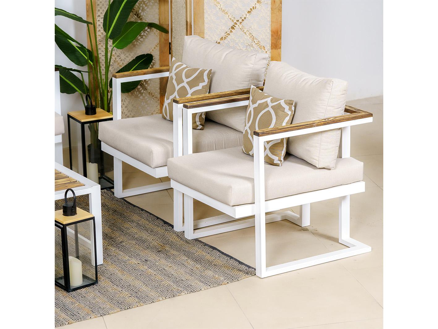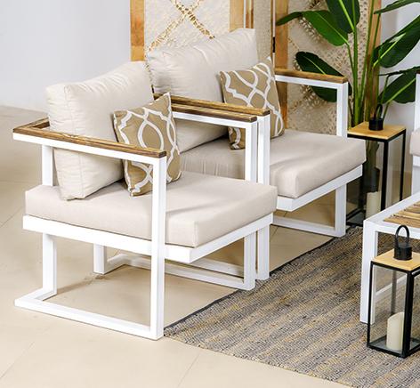 يعتبر استخدام الخشب الطبيعي في التصميم عنصرًا جماليًا يجذب الأنظار، حيث يضفي لمسة من التميز والذوق الرفيع على الأثاث. الإطار المعدني الأبيض يبرز بشكل مثالي مع الأقمشة البيج، مما يجعلها تتناغم بسلاسة مع مختلف تنسيقات الحدائق، من المساحات الحديثة إلى التقليدية.